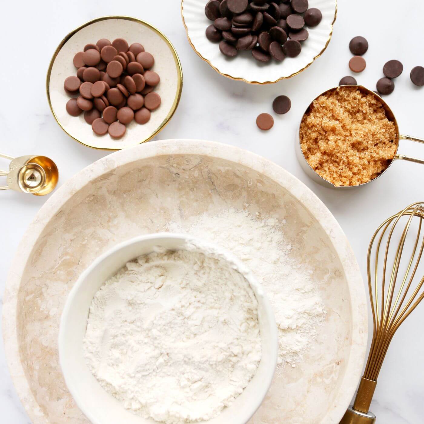 Chocolate chip: self-raising flour, unsalted butter, caster sugar, brown sugar, dark & milk chocolate chips, vanilla extract, eggs, salt, baking powder