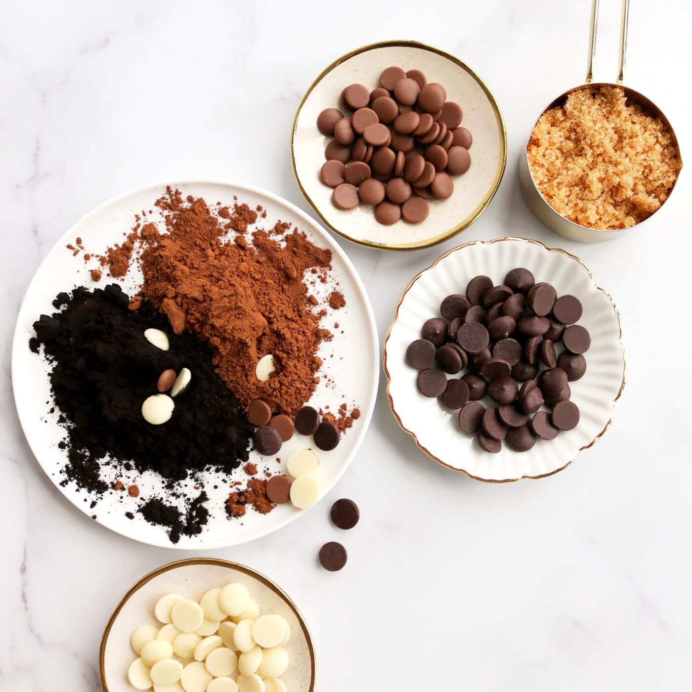 Triple chocolate: self-raising flour, alkalised cacao powder, unsalted butter, caster sugar, brown sugar, dark, milk & white chocolate chips, eggs, bicarbonate of soda, salt.